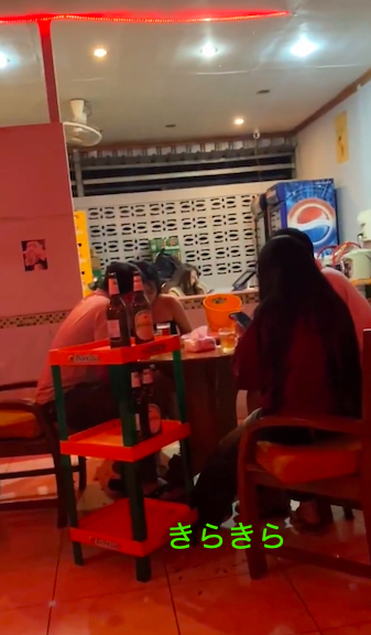 手前のロングヘアのカジュアルの方が多分若い、二十前か。向かいのセクシーでも二十歳くらいだと思う。奥にいるのはママさんか?料理担当はおっちゃん
